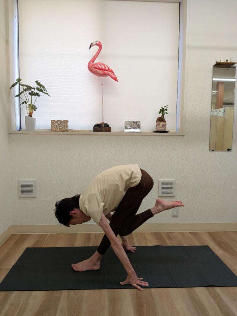 後ろのフラミンゴの置物のように、先生もすごい体勢をされています(笑)